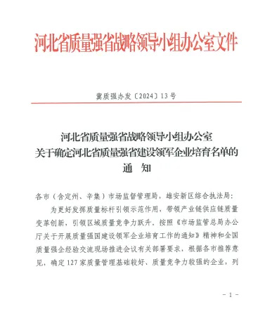 近日,河北省質量強省戰略領導小組發布通知,河北滄海核裝備科技股份有限公司入選河北省質量強省建設領軍企業培育名單,這也是滄海核裝獲得政府質量獎后獲得的又一質量建設領域的榮譽資質。